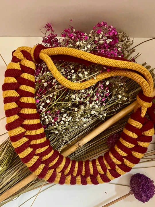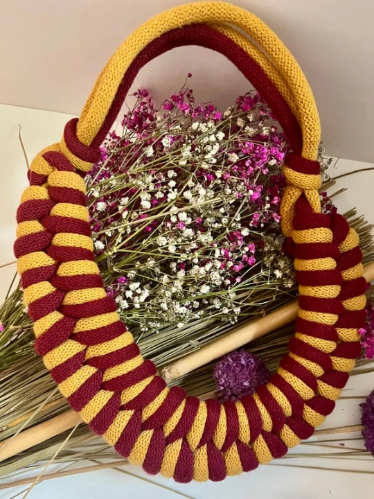 Su diseño bicolor en mostaza y rojo vino lo convierte en una pieza llamativa, ideal tanto para looks casuales como para dar un toque original a un outfit elegante.